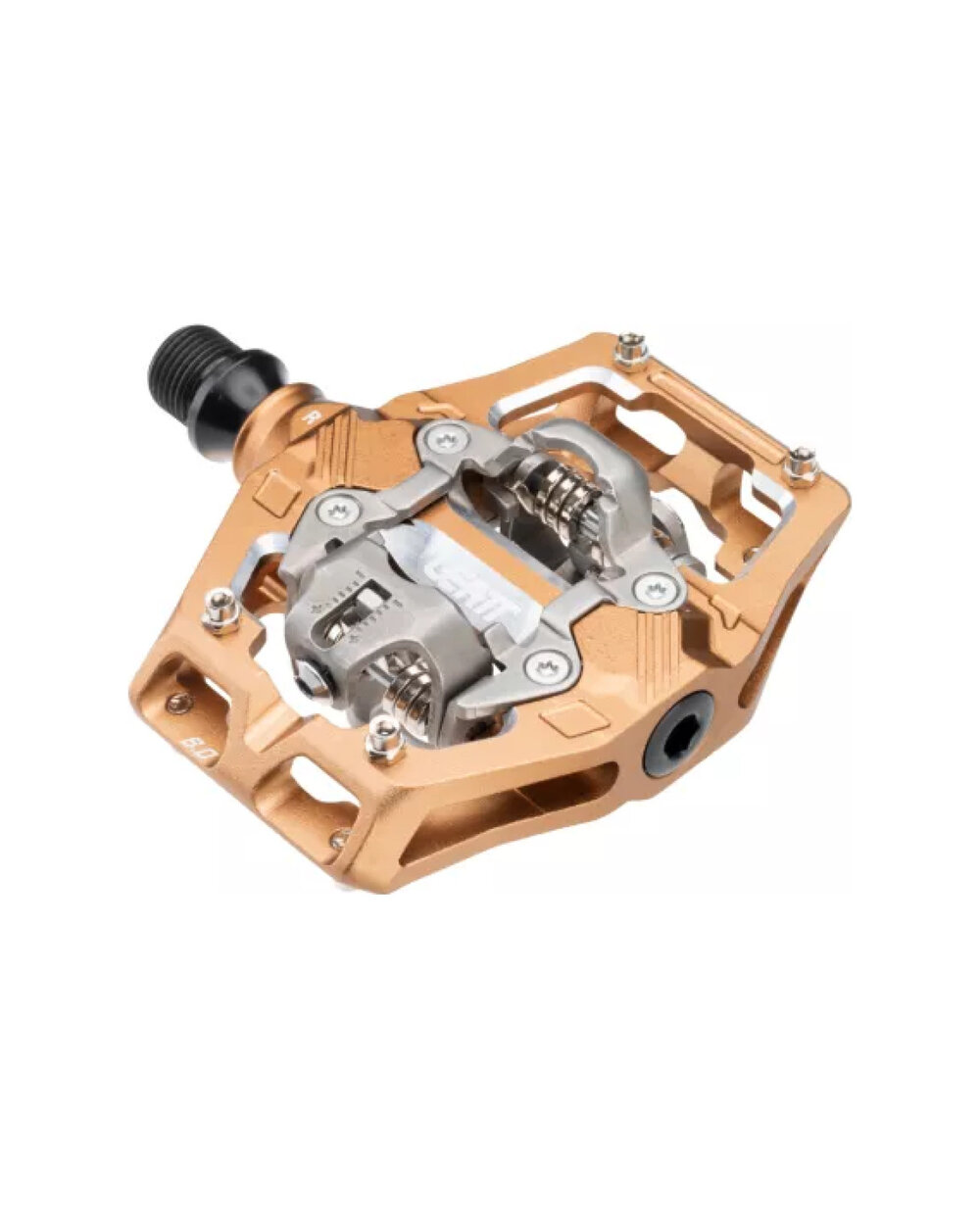 Середньо -велику платформу для фіксованої завантажувальної підтримки для кращої передачі живлення Зменшені передні частини полегшують надягати взуття Шпильки підвищують стабільність та тягу в технічних ситуаціях після послаблення з педалі Анодована обробка рушниці допомагає зменшити втому та знижує ризик поширення тріщин Максимальна довговічність з подвійними ущільнювачами та системою потрійного підшипника Подвійна система кріплення кліпу Позитивна проводка та зворотній зв'язок Зв'язування нержавіючої сталі з тертям, що зменшує покриття Регульована пружинна напруга для послідовного розгортання та випуску 5 градусів вільного руху Кузька та ЧПУ обробляла Chrome-Molybden Steel SNCM220, розроблена для вимогливих умов Вага: 233 грам на педаль, 466 грам на пару