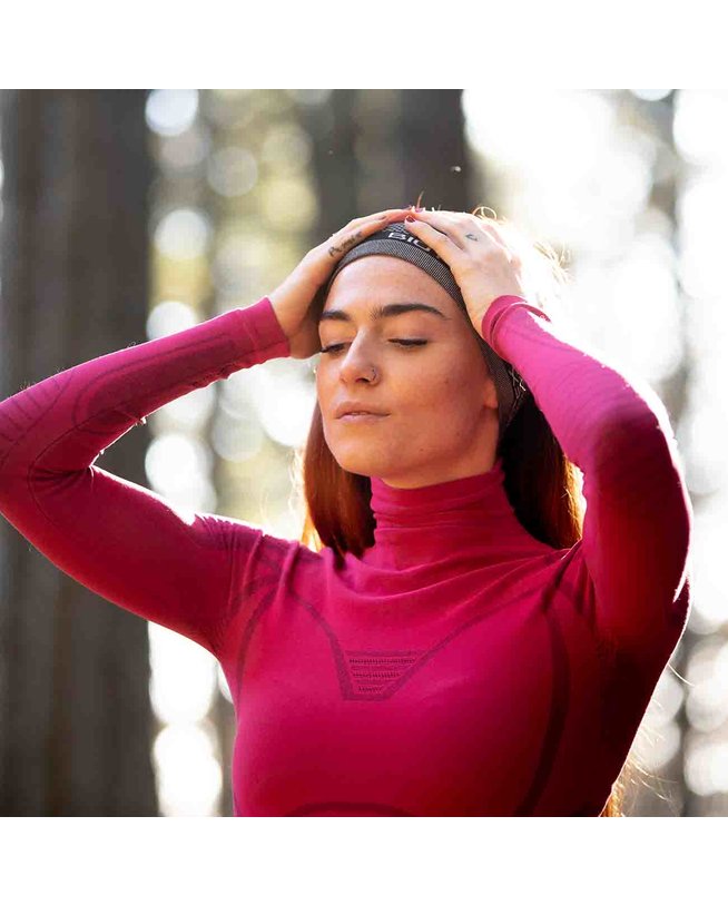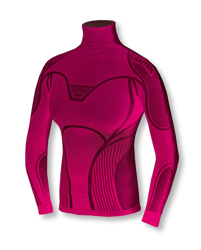 Футболка з водолазка з еластичного матеріалу без шва. Еластичність в обох розмірах плетіння гарантує найкращий комфорт завдяки ідеальному обляганню кузова. Ця надзвичайна гнучкість матеріалу, а також відсутність бічних швів та потужних особливостей забезпечує ідеальний синтез між технологією та інновацією. Дизайн підкреслює жіноче тіло, а можливість налаштувати довжину рукава та шиї робить його унікальним елементом.